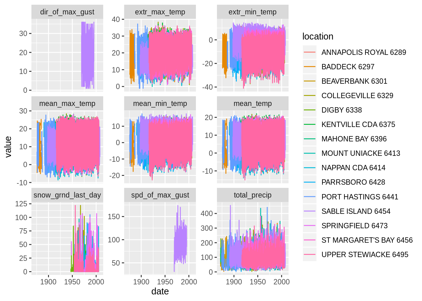 In this vignette we will use the ns_climate dataset within the mudata2 package, which is a collection of monthly climate observations from Nova Scotia (Canada), sourced from Environment Canada using the rclimateca package.