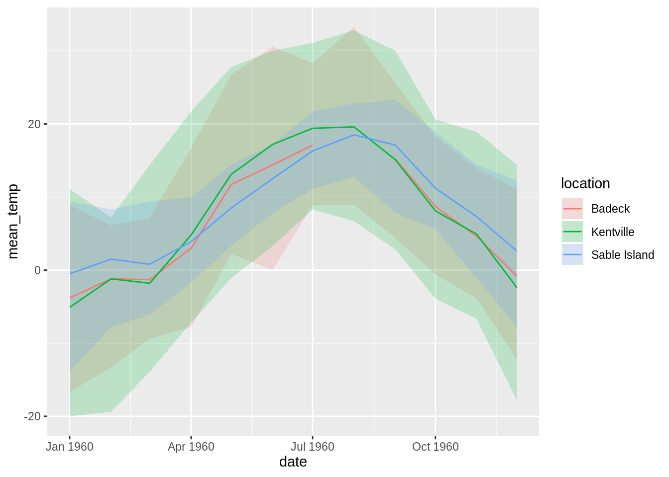 We can then use this data with ggplot2 to lead us to the conclusion that three locations in the same province had more or less the same monthly temperature characteristics in 1960.